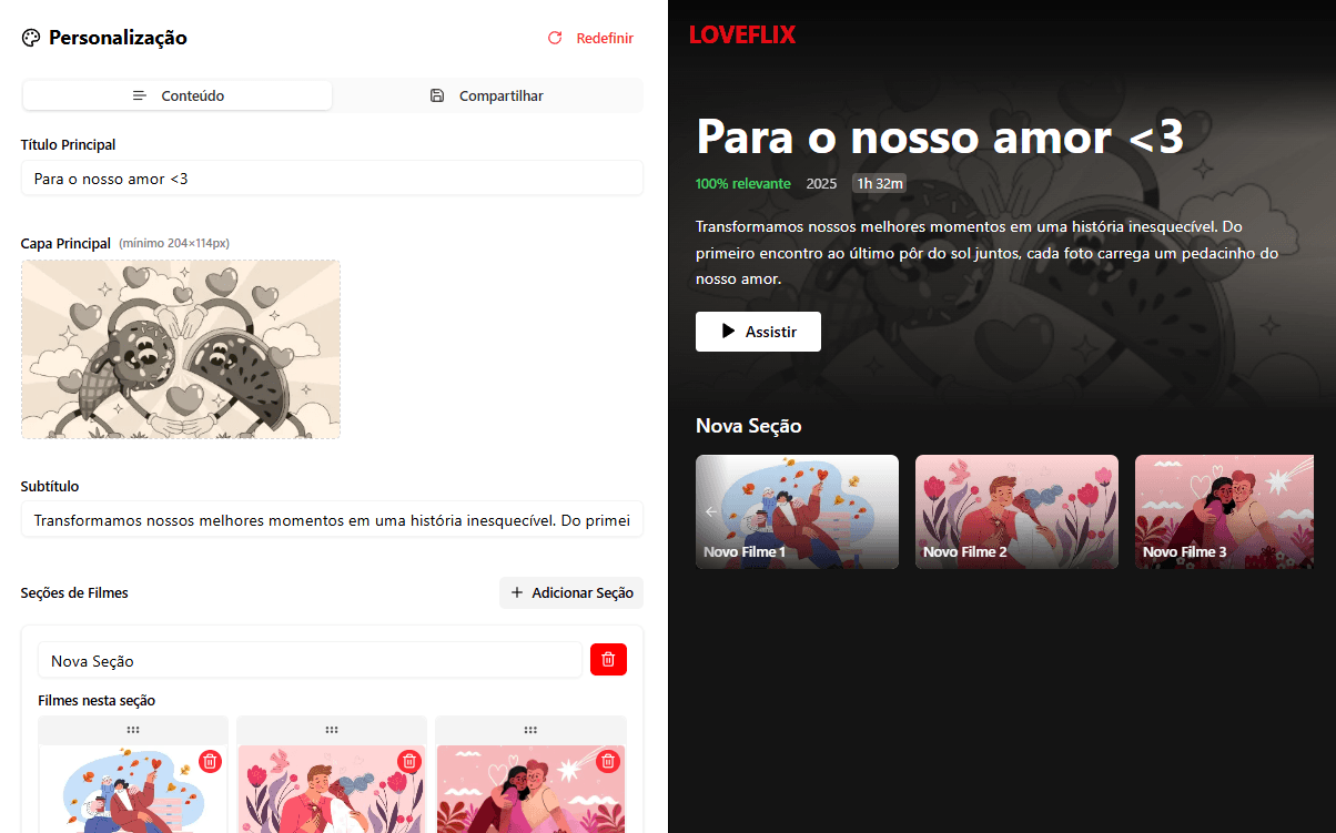 Faça upload das imagens mais especiais e crie uma mensagem personalizada para seu amor.